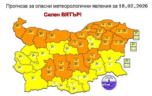 За 18 февруари 2026 г. НИМХ издава предупреждение за опасни метеорологични явления от